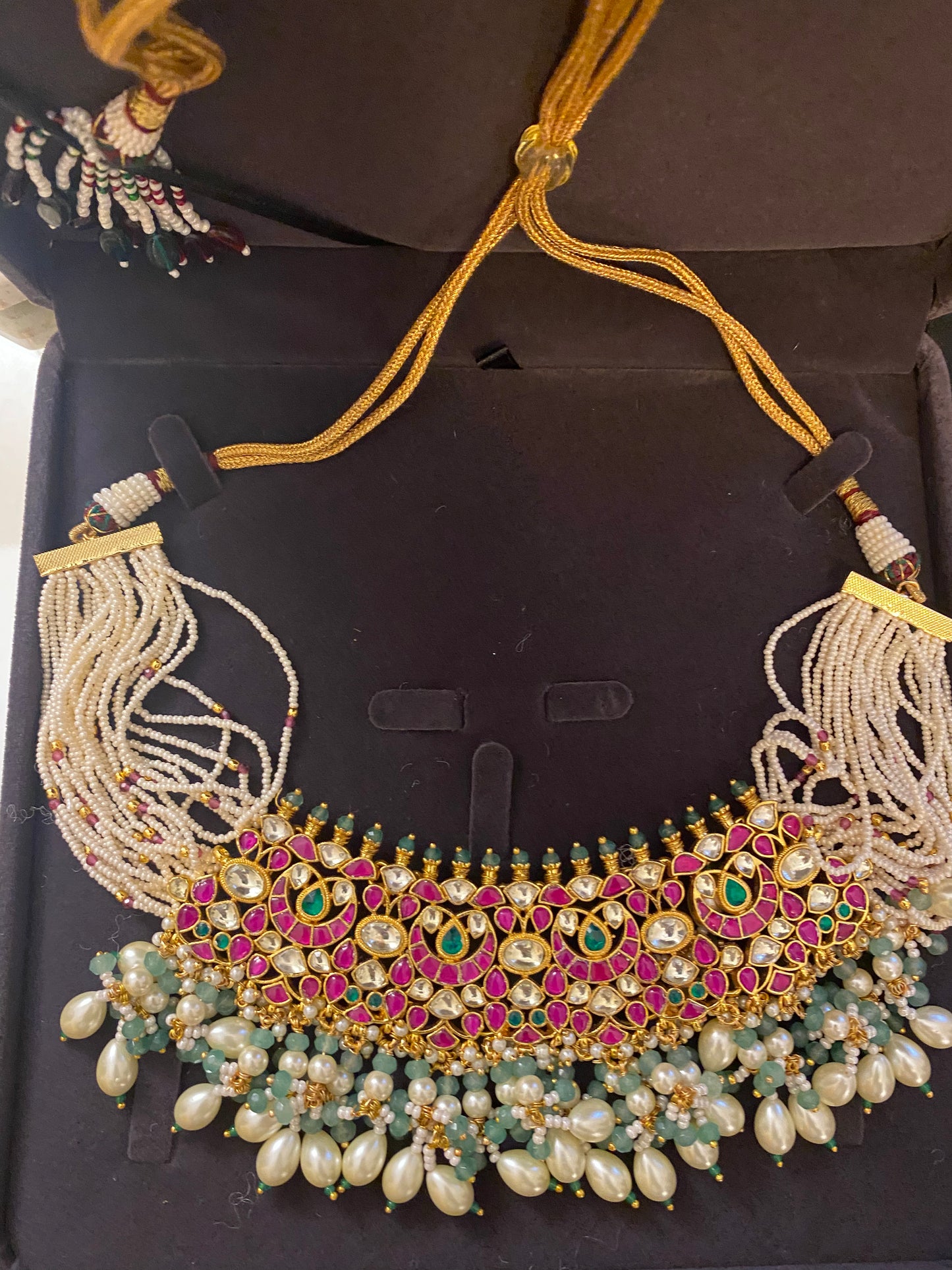 This beautiful three piece set is a beaded, Kundan, Bridal Set. It comes with a choker, earrings, and a matha pathi. The stones on the necklace and the quality of the necklace makes it a one of a kind. Take time to appreciate the beauty of the design and details. The color schemes are very sought after and popular for South Asian weddings. The necklace has an adjustable strap. The earrings are long and heavy. The matha pathi ties the set together with the same intricate detailing as that of the necklace. It is exquisitely handcrafted in India by skilled artisans and craftsmen. It’s the perfect bridal piece!